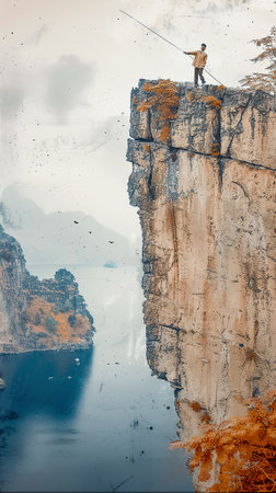 Man fishing on the edge of a cliff. Collage. Toned.