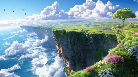 A breathtaking view of a coastal cliff adorned with lush vegetation and colorful wildflowers, set against a clear blue sky and fluffy clouds. Ideal for nature lovers.