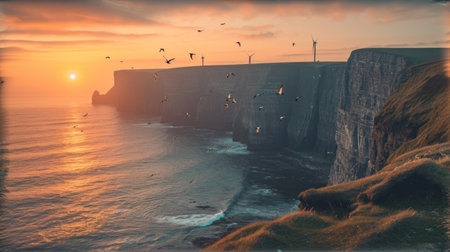 sunrise over the cliffs at solstice ocean showcases a gravity-defying landscape with a dramatic atmospheric perspective. captured in a tilt-shift photography style, the image features a striking contrast between dark white cliffs and a sky-blue backdrop. this french landscape, viewed from an aerial perspective, exudes a primitivist style that adds to its unique allure. ai generated