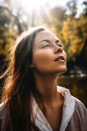 A serene portrait of a young woman with flowing hair, bathed in warm sunlight. The image conveys a sense of tranquility and natural beauty, perfect for lifestyle themes.