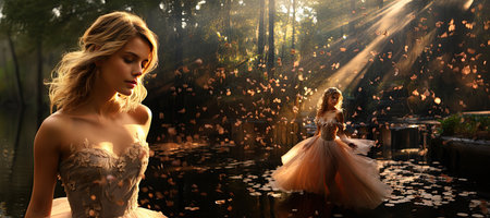 Double exposure of woman face and trees reflection in water. Concept of beauty and nature.