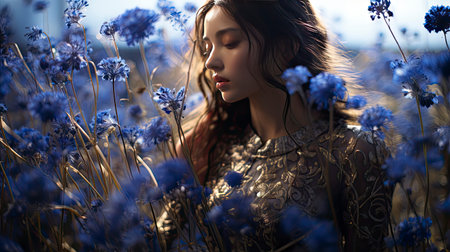 Young beautiful woman with a bright shining glittering make up lying on a green meadow with yellow flowers.