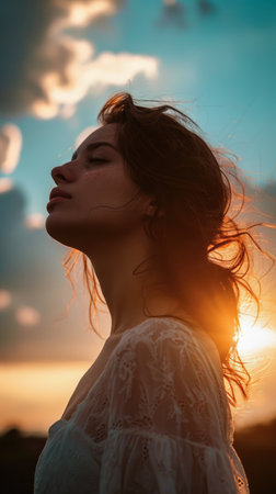 Silhouette of a woman at sunset. Peaceful and calm atmosphere.