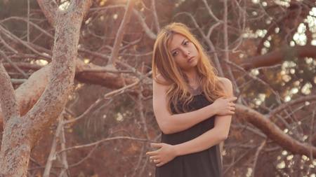 An attractive girl with brown long hair touching and looking up at the leaves of a tree