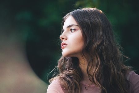 Atmospheric portrait of young beautiful woman, long hair and casual makeup, nature background