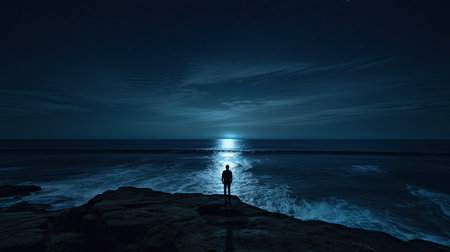 A young woman is watching the sunset. A woman stands on a cliff in front of the sea. Standing with his back in the dark