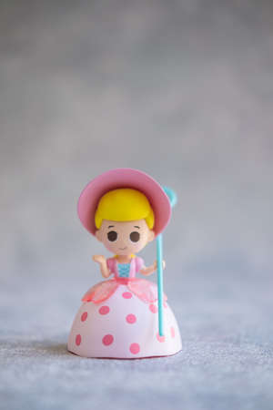 BANGKOK, THAILAND - January 25, 2022 : Cute toy in a blind box, Miniso. Bo Peep is a supporting character in Toy Story. She is a porcelain shepherdess figurine and Sheriff Woody's girlfriend.