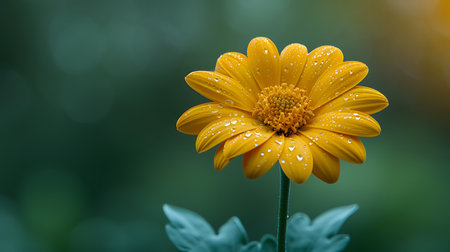 A vibrant yellow daisy, adorned with glistening water droplets, stands out against a blurred, deep green background, creating a serene and refreshing natural scene.