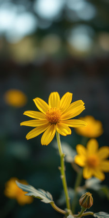 Yellow daisy with blurred bokeh background, serene nature view. Floral beauty and tranquility concept