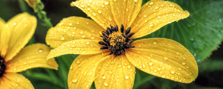 Vivid yellow flower displaying raindrops on petals in a vibrant garden, showing nature's beauty after a refreshing rain.
