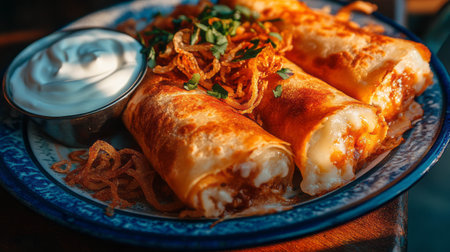 AI Generated. Burrito with meat and cheese topped with melted mozzarella and crispy chicken wrap on a plate