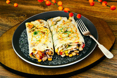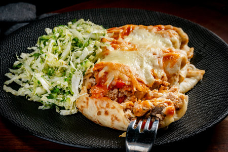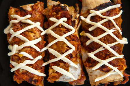 The traditional food of Latino-Americans is encheladas. Pita stuffed with meat and vegetables. On a dark background close up