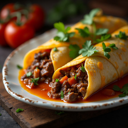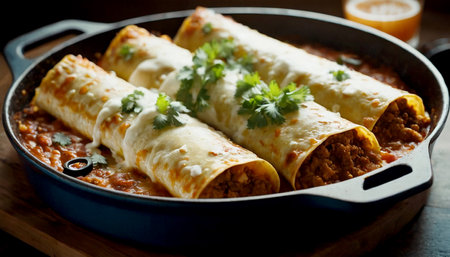 Mexican enchiladas with beef and vegetables on wooden background