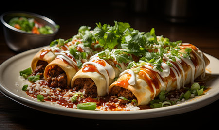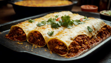Traditional Mexican dish enchiladas with meat and vegetable filling, baked in the oven. AI generated.