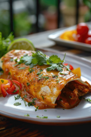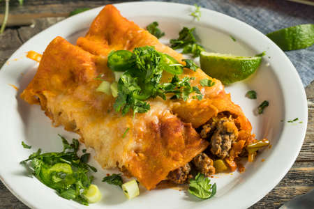 Mexican enchiladas with beef, cheese and vegetables served on a plate