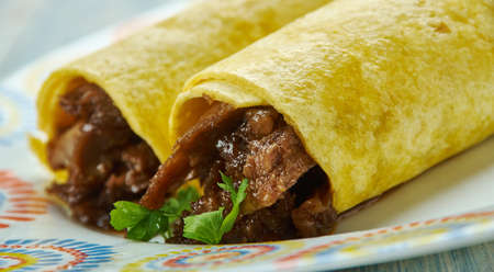 Mexican beef burritos with tomato sauce and parsley, selective focus