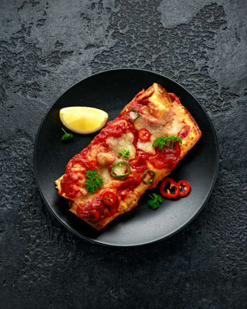 Mexican food. Cuisine of South America. Traditional dish of spicy beef enchiladas with corn, beans, tomato. On a baking tray, on a black stone background. Top view copy space