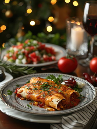 AI Generated. A plate of enchiladas with cheese and tomatoes sits on a table with other food items