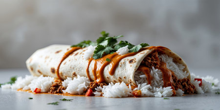 AI Generated. Large Burrito with Rice and Creamy Sauce Close Up
