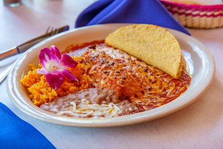 Traditional mexican enchiladas with meat, cheese and vegetables