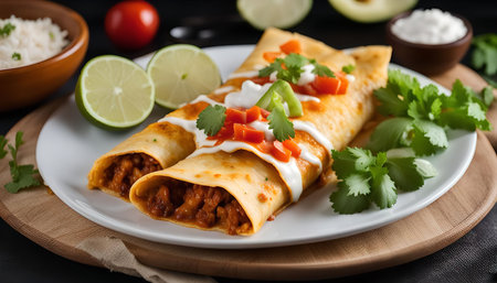 A close-up image of two enchiladas on a black plate, garnished with sour cream, cilantro, and lime. The dish is served on a wooden table and surrounded by other Mexican food staples.
