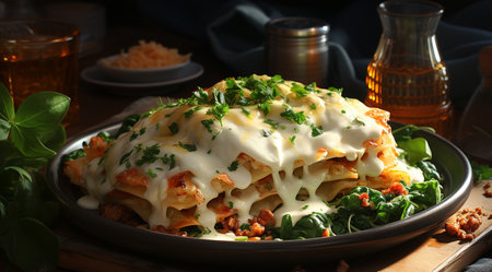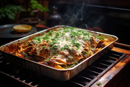 homemade lasagna fresh from the oven, steaming, created with generative ai