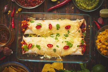 Vegetable Burritos served in glass heatproof dish. With salsa, guacamole, nachos and various ingredients on side. Top view. Tasty mexican homemade food concept.