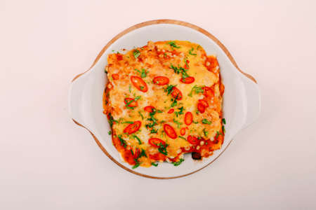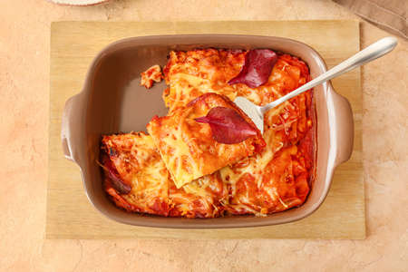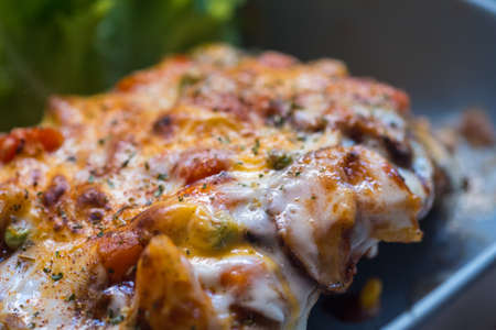 Baked lasagna with cheese, tomato and parsley in baking dish
