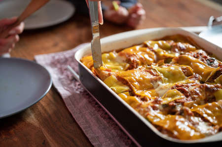Cutting delicious homemade vegan lasagna in a pan on a domestic dinning table.