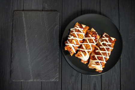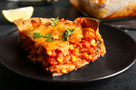 Mexican food. Cuisine of South America. Traditional dish of spicy beef enchiladas with corn, beans, tomato. On a baking tray, on a black stone background. Top view copy space