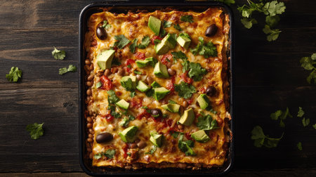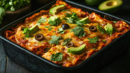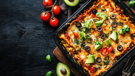 A fresh, healthy lasagna made with chicken and beans, topped with pitted olives, avocado, and coriander, baked in a black dish and placed on a dark wooden table, creating a wholesome meal scene.