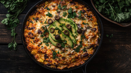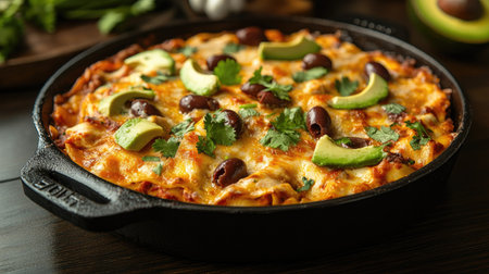 A hearty chicken and bean lasagna, gluten-free and topped with olives, avocado, and fresh coriander, baked in a black dish, placed on a dark wooden table for a rustic, healthy vibe.