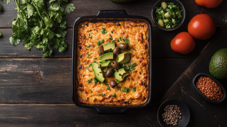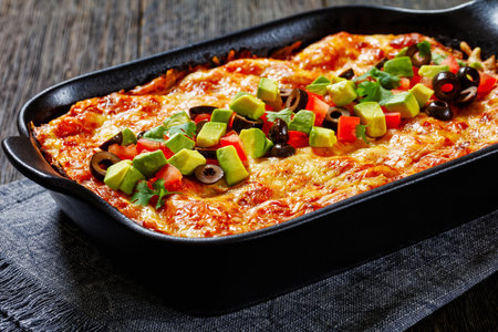 close-up of Healthy chicken and bean gluten free lasagna topped with pitted olives, avocado, tomatoes and fresh coriander in black baking dish on dark wood table