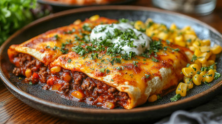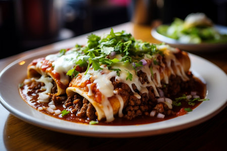 Mexican enchiladas with beef, cheese and vegetables served on a plate