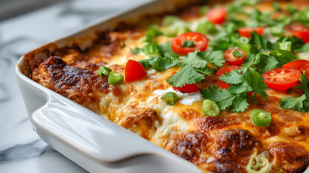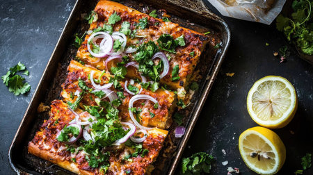 A mouthwatering tray of baked enchiladas topped with fresh herbs and onion, served with lemon. Perfect for a flavorful and vibrant meal.