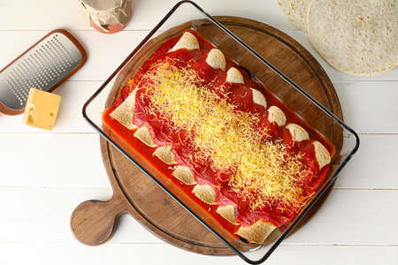 Baking dish with tasty cooked enchilada on white wooden background with space for text