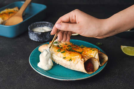 enchiladas stuffed with vegetables and meat with melted mayonnaise on a wooden table