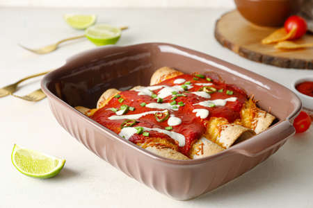 Baking dish with tasty cooked enchilada and ingredients on light background