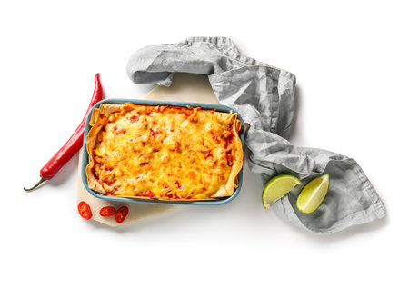 Traditional mexican red baked enchiladas with melted cheese and sour cream on white background