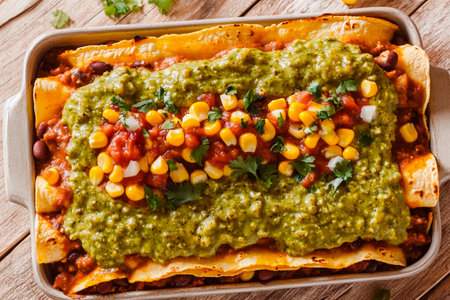 Green Chile Enchilada Casserole of corn tortillas layered with refried beans, corns, sauce and cheese, topped with pico de gallo in baking dish on wood table, close-up