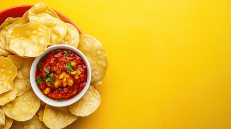 Enjoy a vibrant scene featuring crispy tortilla chips accompanied by fresh salsa on a stunning yellow backdrop, ideal for food lovers and snack enthusiasts.