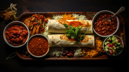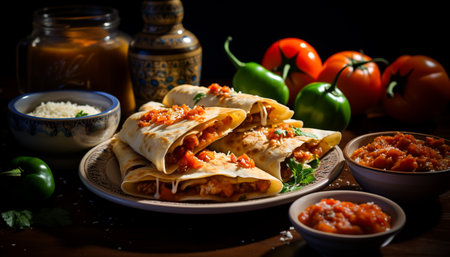 A plate of Mexican food: grilled beef, fresh vegetables, homemade sauce generated by artificial intelligence