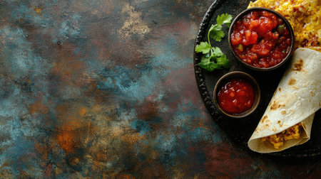 Indulge in the vibrant colors and flavors of freshly prepared tacos served with zesty salsa and garnished with cilantro on a rustic backdrop.