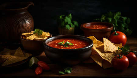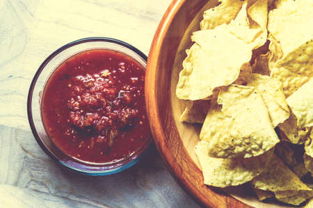 Mexican crispy tortilla chips with spicy red tomato salsa