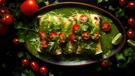 An AI generated illustration of a plate of enchiladas suizas, rolled tortillas filled with chicken