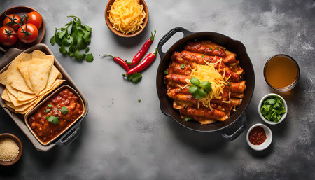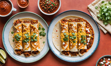 AI Generated. A plate of enchiladas with cheese and tomatoes sits on a table with other food items
