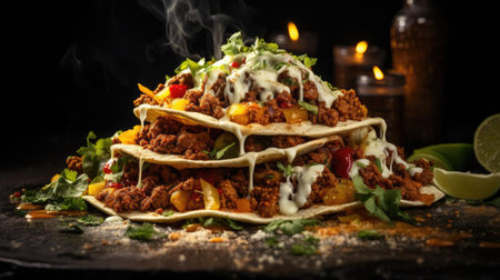 Delicious mexican tacos with beans, rice, and vegetables on colorful table. That the image is generated using AI.