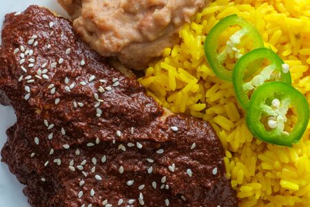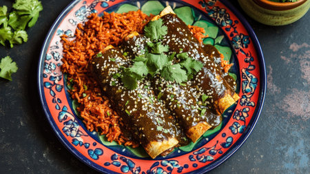 Enjoy a plate of hearty mole poblano enchiladas served with flavorful rice, garnished with fresh cilantro for a colorful and appetizing meal.