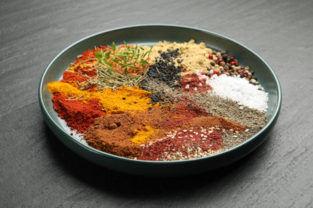 closeup of a wooden spoon full of red curry powder, on a wooden plate, and some other spices and seasonings in different spoons and scoops on a dark stone surface
