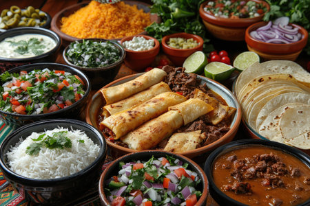 Traditional Mexican meal showcasing crispy taquitos with salsa, fresh guacamole, and tortilla chips, set in a vibrant outdoor atmosphere filled with colorful decor